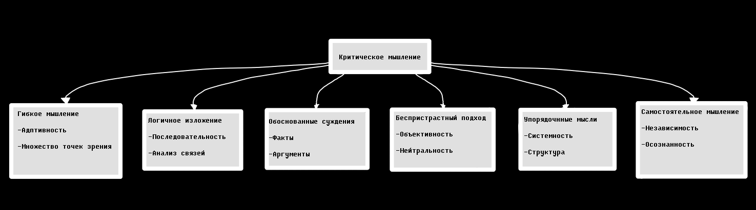 Объективность Определение: Способность оценивать информацию независимо от личных предубеждений Особенности: Признание возможных ошибок в своих рассуждениях Готовность менять мнение при появлении новых фактов Нейтральная оценка аргументов Пример применения: При обсуждении спорных вопросов критически мыслящий человек способен рассматривать различные точки зрения и признавать сильные аргументы противоположной стороны.